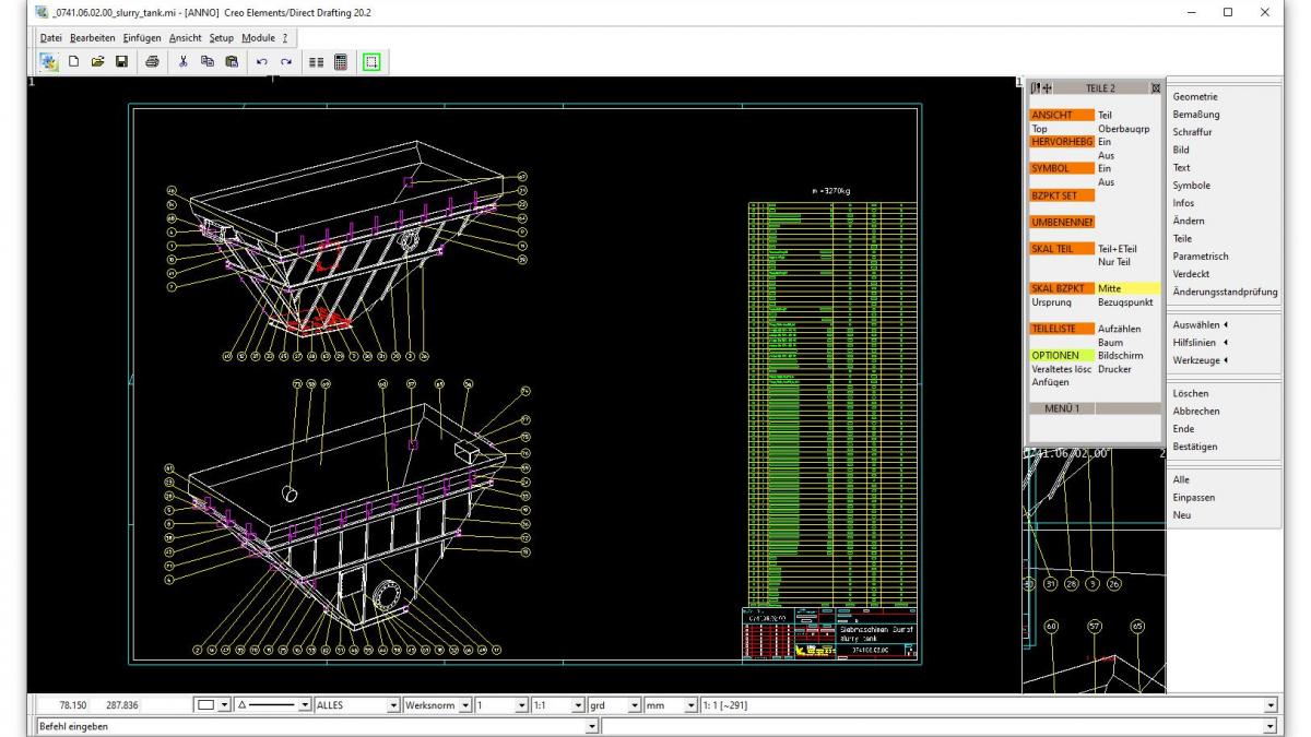 PTC Elements/Direct Drawing-Model Manager: Relationale Datenbank mit Versionierung, Freigabeprozesse automatischem Ausfüllen von Zeichnungsköpfen.